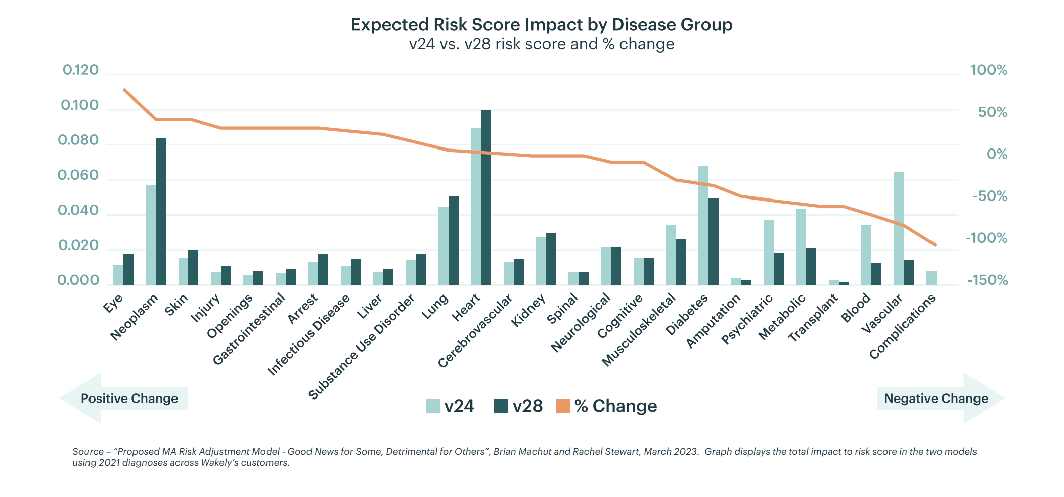 Source – “Proposed MA Risk Adjustment Model - Good News for Some, Detrimental for Others”, Brian Machut and Rachel Stewart, March 2023. Vascular Risk score impact projected to fall from 0.065 to 0.014 (79% decline), Psychiatric risk score impact projected to fall from 0.037 to 0.019 (50% decline).